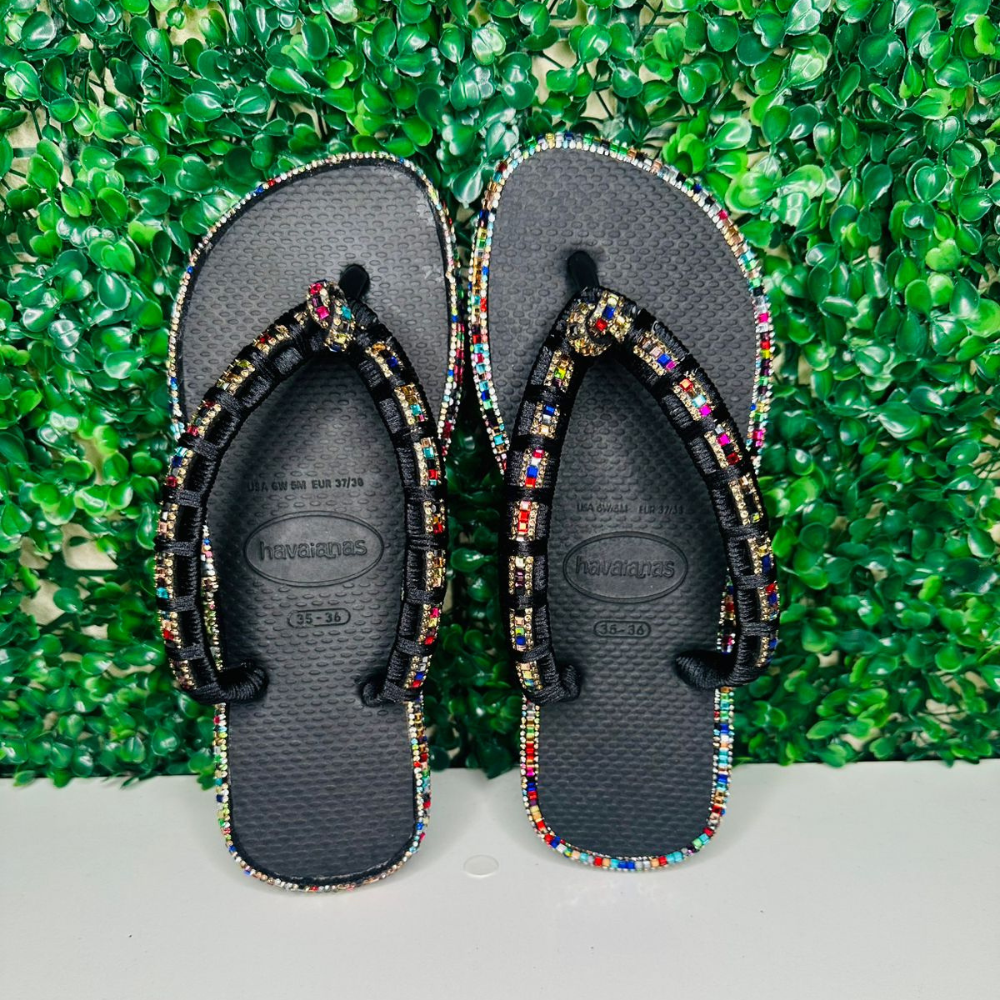 Nossos chinelos são produzidos com Havaianas originais e decorados manualmente com pedrarias de primeira linha, garantindo beleza, conforto e durabilidade em cada detalhe.